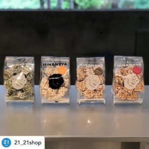 「ひなのや」は従来の古く素朴な印象を一新する”ポン菓子専門店”です。地元である愛媛県西条市で作られたお米を原料に、国内外のよい素材を取り入れてポン菓子製作をされています。昔ながらのシンプルな味付けのものから、現代風にアレンジしたものまでたくさんのフレーバーがあり、ちょっとしたお土産や、楽しいおやつの時間にぴったりの商品です!21_21 SHOPでは、新宮かぶせ抹茶(夏季限定)・伊予柑・黒蜜きなこ・キャラメルナッツの4種類をお取り扱いしています。展覧会にお越しの際は、ぜひお手に取ってご覧ください。